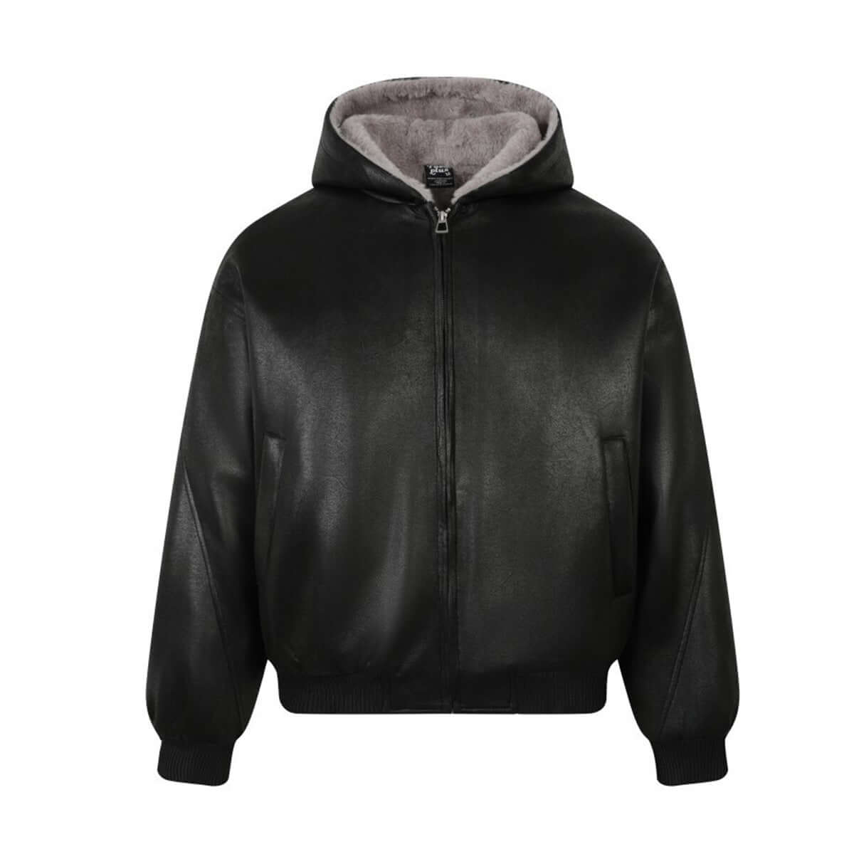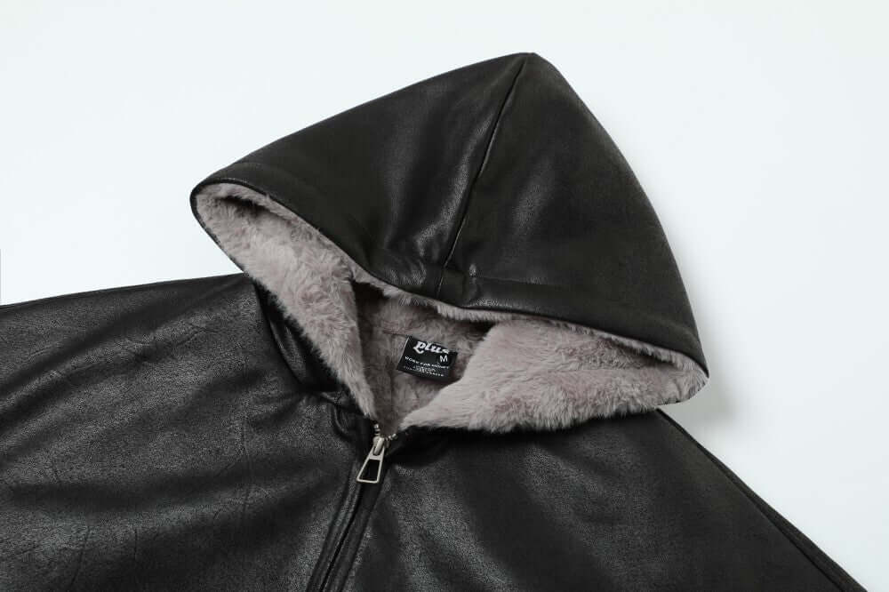 • Fur Collar Hooded Winter Jacket – Loose Fit in black leather with grey fur lining, perfect for stylish winter casual wear.