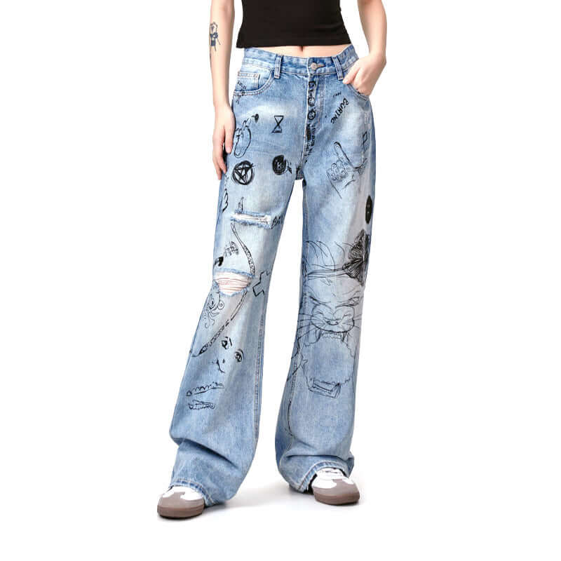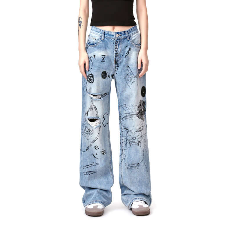 Abgenutzte Denim-Hose mit Graffiti-Druck