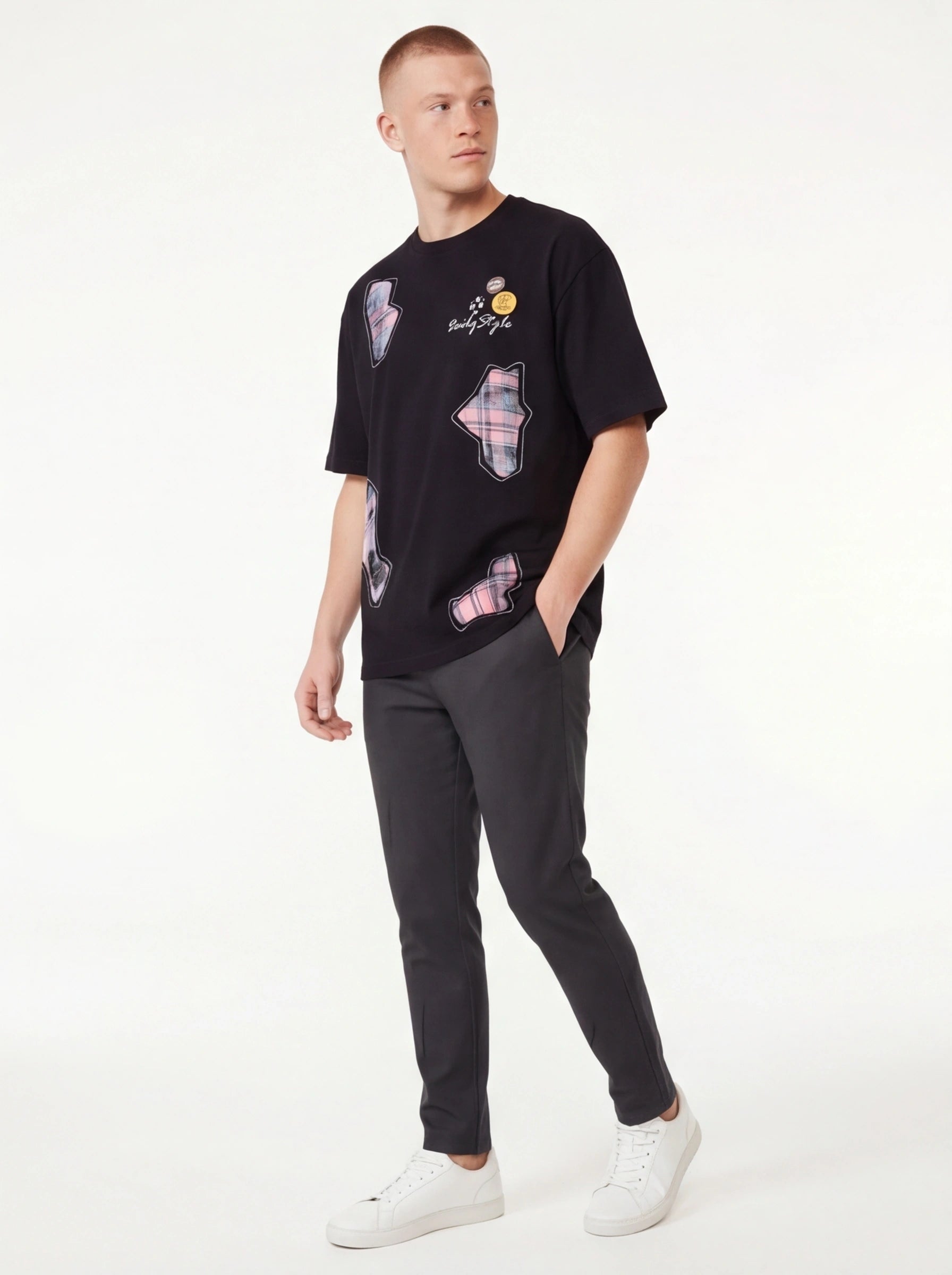 Entrez dans les rues avec confiance en portant le T-shirt Graphique avec Badge Appliqué de Grozavu, un mélange parfait de...