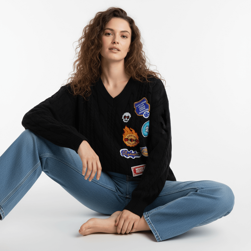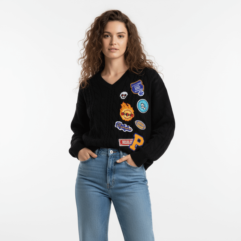 Pull en V en tricot torsadé brodé