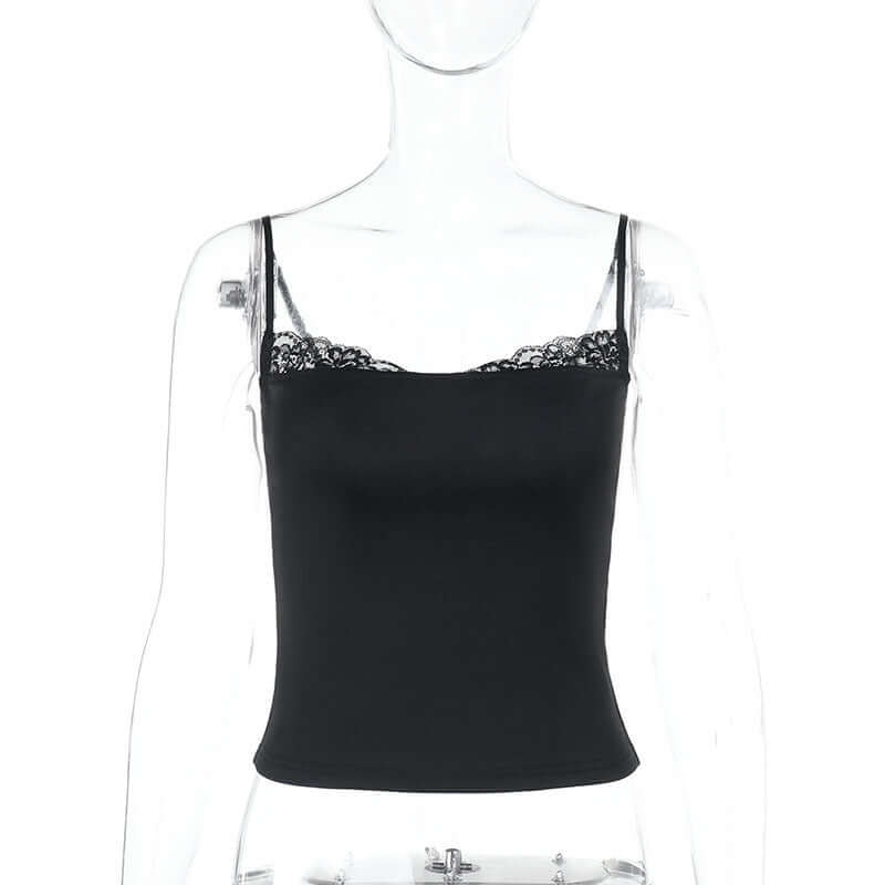 • Patchwork Lace Camisole Top – Slim Fit on a mannequin, featuring delicate lace detailing and a sleek silhouette.