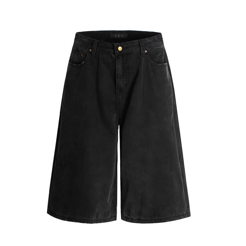 • Elastic Waist Denim Shorts – Straight Fit in black with a half-elastic waistband and a relaxed fit.