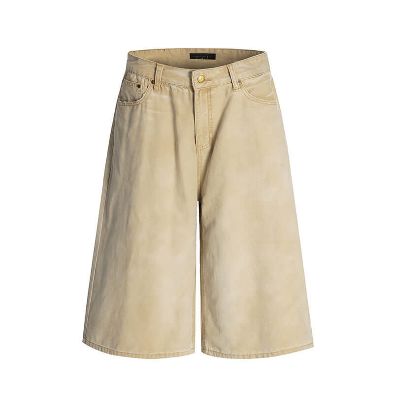 • Elastic Waist Denim Shorts – Straight Fit in a light beige color with a relaxed fit for summer style.
