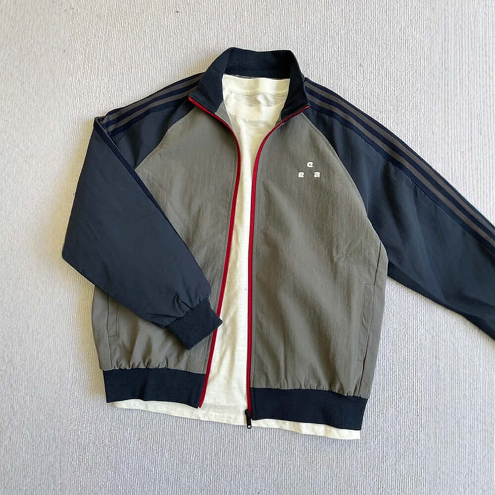 • Three-Stripe Sports Jacket - Loose Fit showcasing a stylish poly fabric design with full zipper and stand collar.