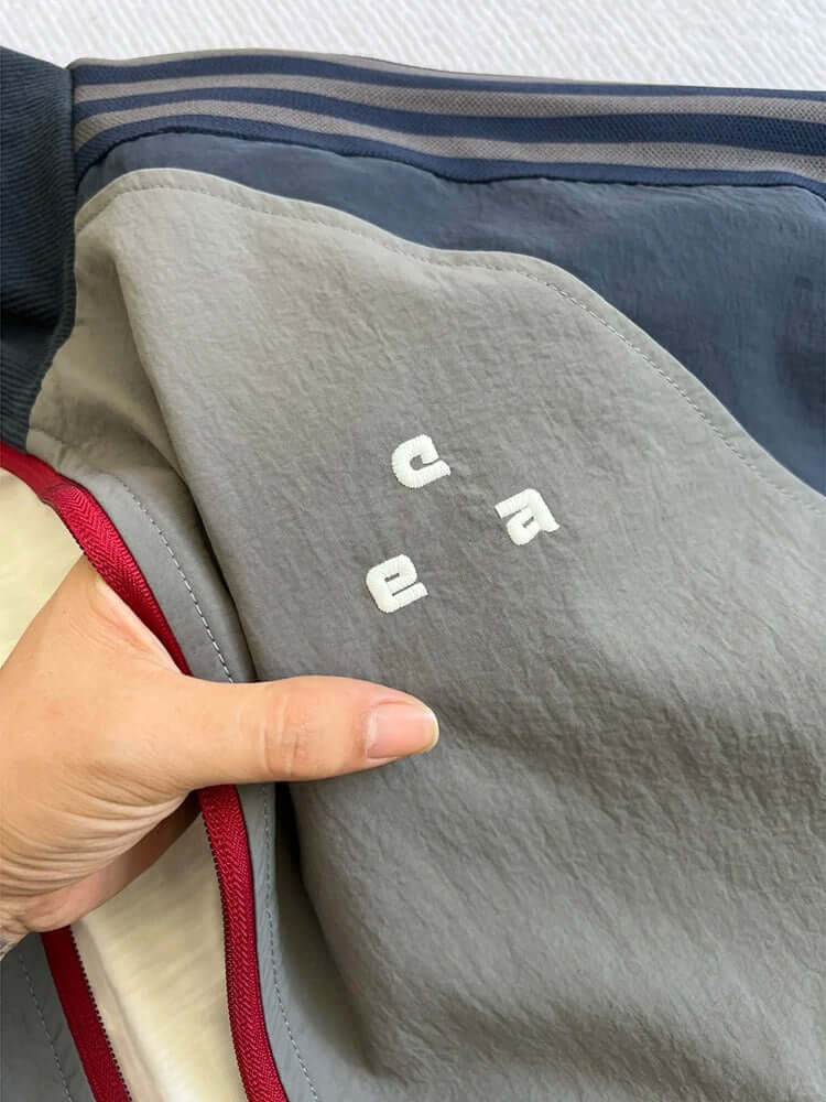 • Three-Stripe Sports Jacket - Loose Fit with stand collar and zipper detail, showing interior lining and fabric.
