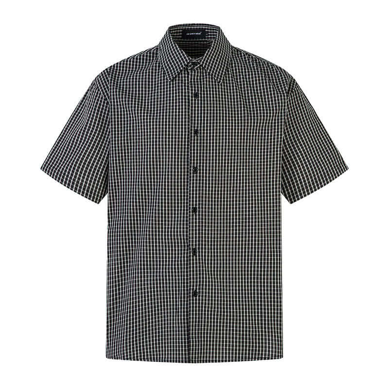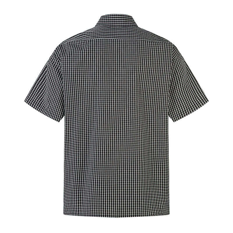 • Short Sleeve Plaid Shirt in black and white check pattern with a comfortable flip collar for casual summer style.