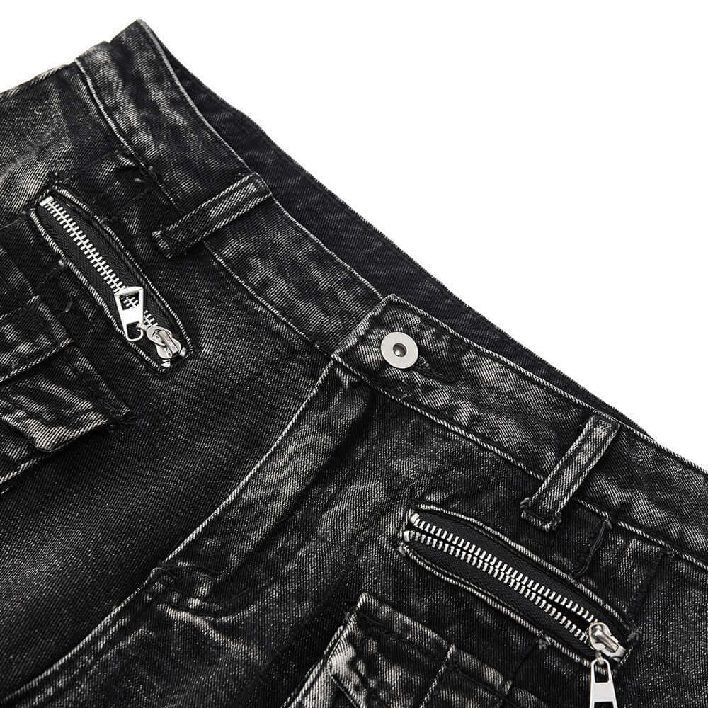 • Belted Distressed Cargo Jeans featuring zipper pockets and a sleek black denim design for a modern street style.