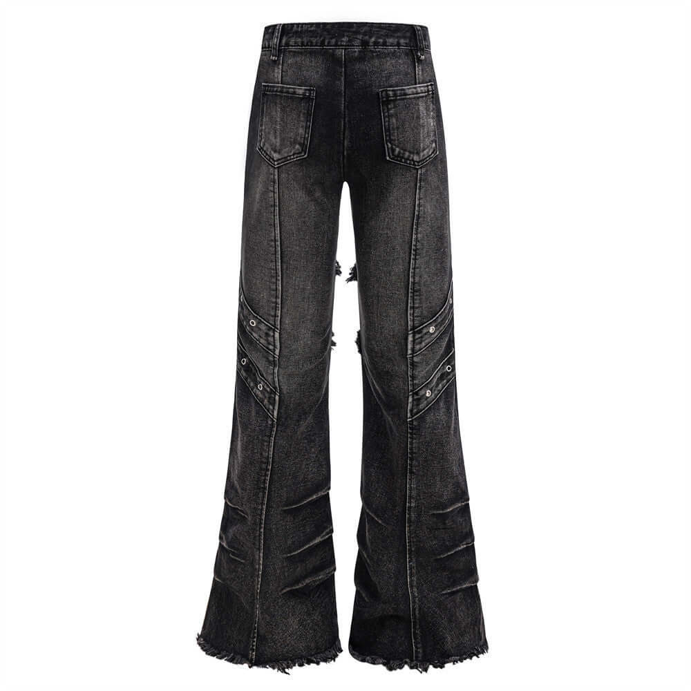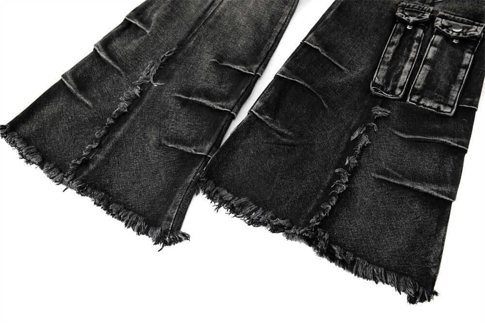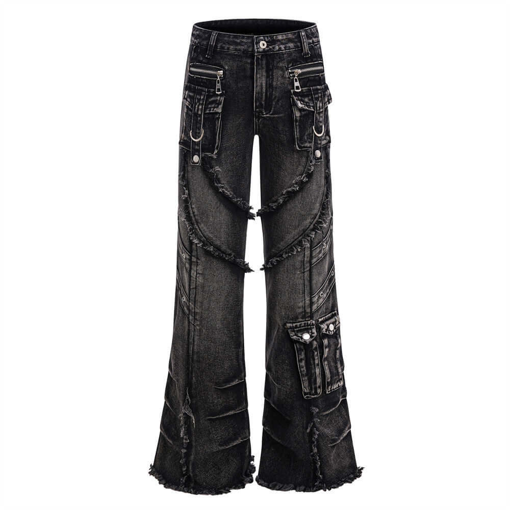 • Belted Distressed Cargo Jeans featuring a unique flared design with raw hem detailing and patchwork splicing.