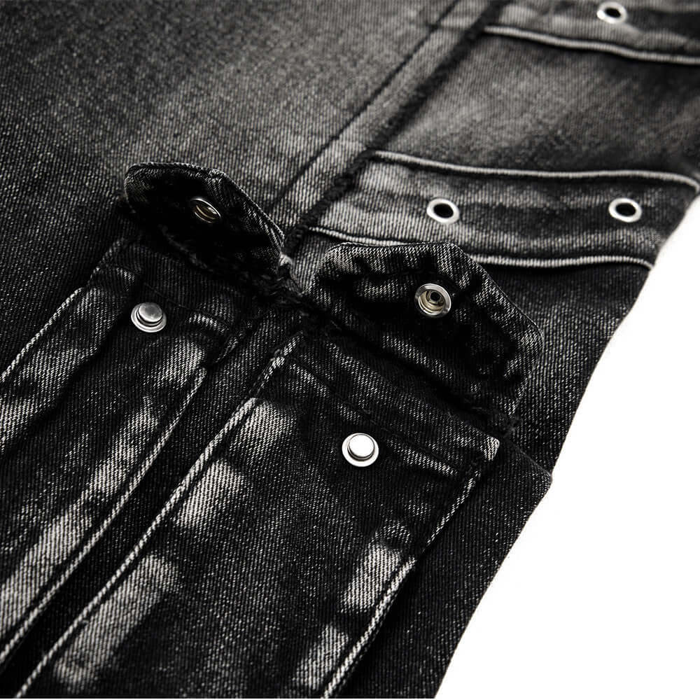 • Close-up of the Belted Distressed Cargo Jeans showcasing heavy-duty snap buttons and textured black denim fabric.