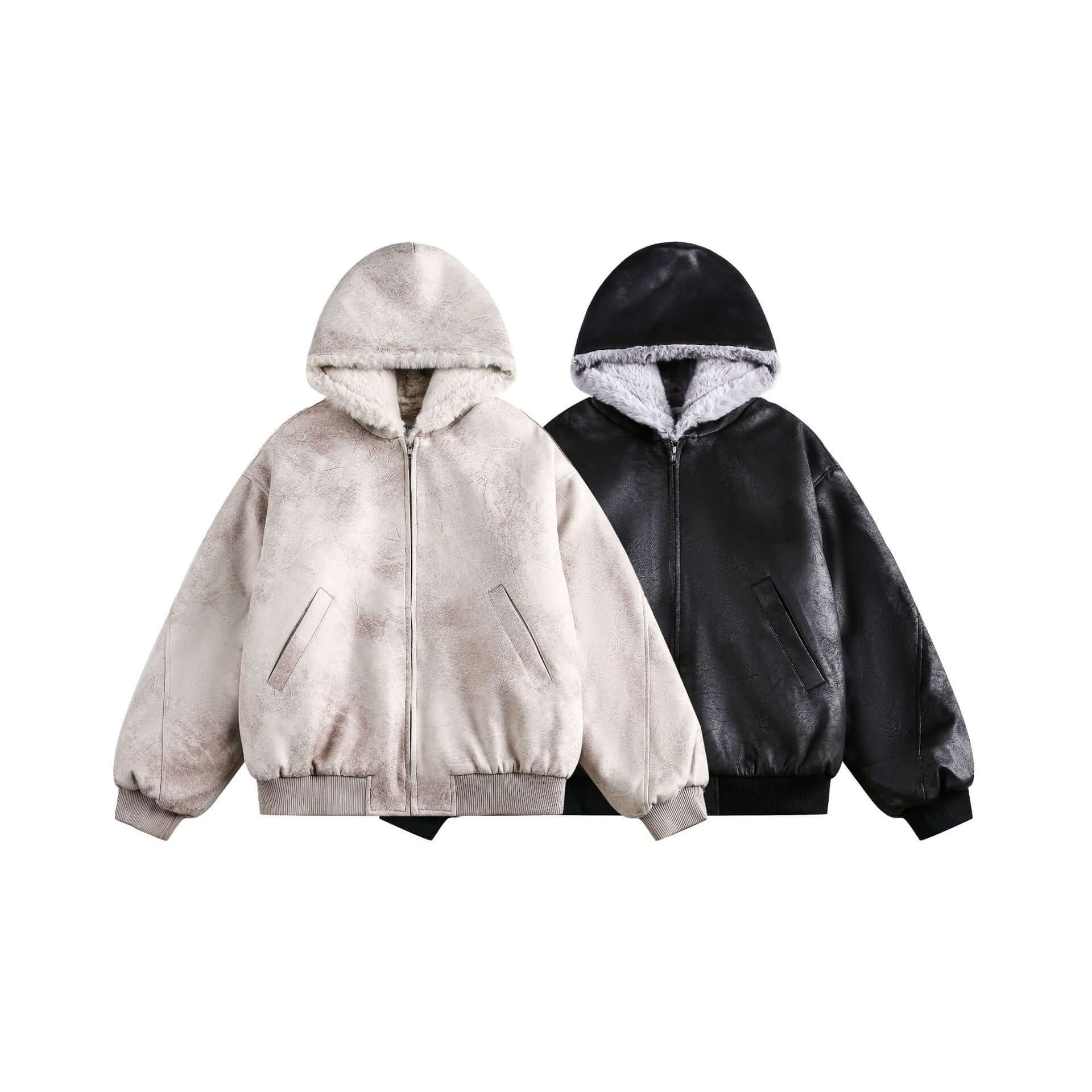 • Crack Pattern Leather Jacket – Loose Fit in black and apricot color options, showcasing stylish street aesthetic.
