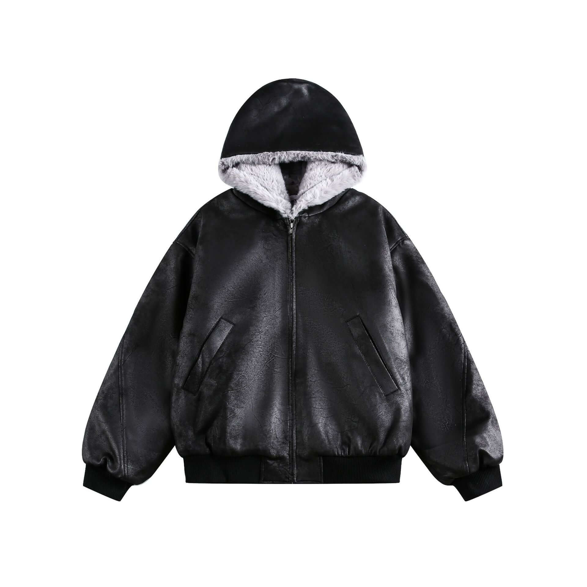 • Crack Pattern Leather Jacket – Loose Fit with hood in black color, featuring a modern oversized silhouette.