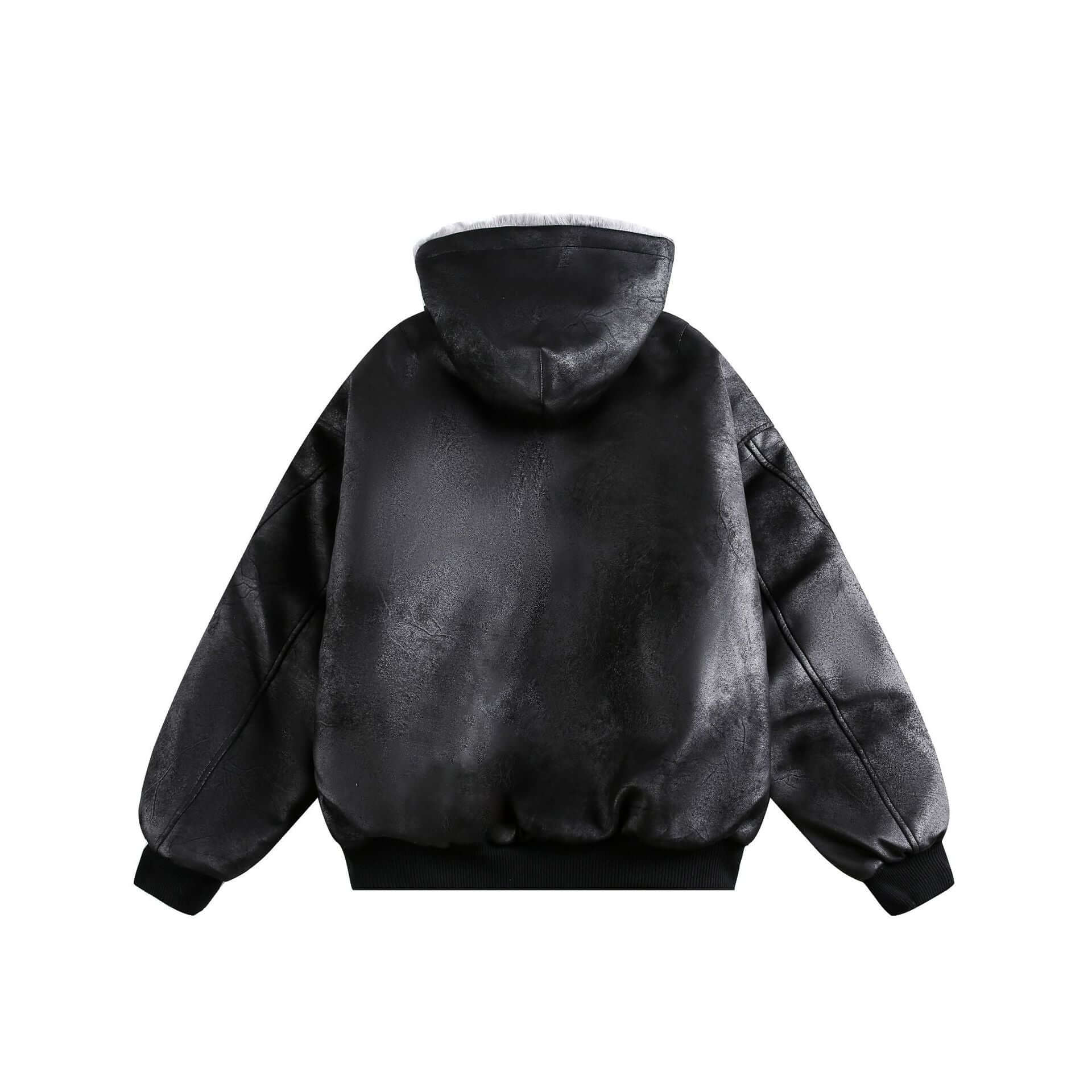 • Back view of Crack Pattern Leather Jacket – Loose Fit in black with hoodie, showcasing its unique crack-pattern design.